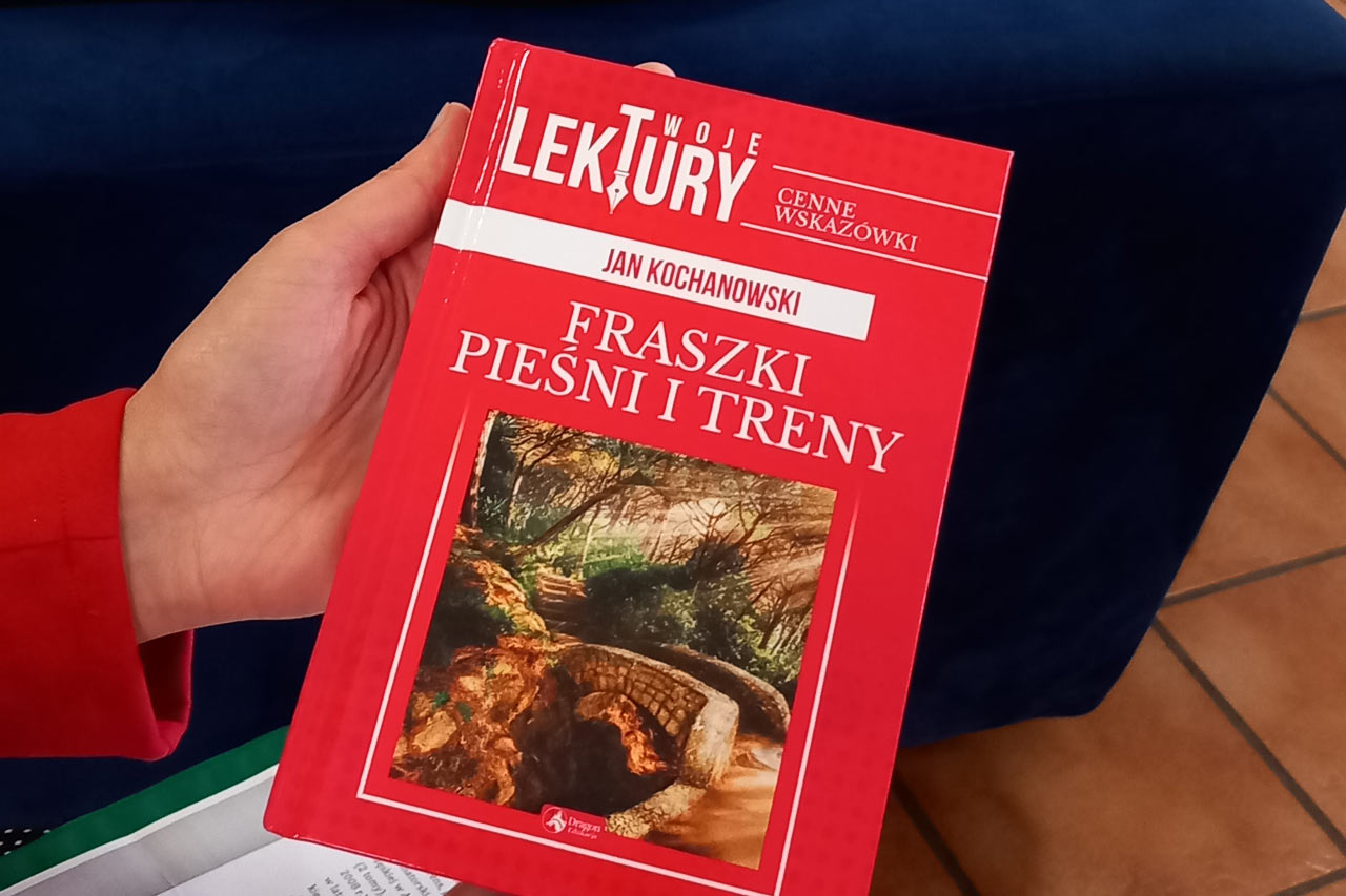 Spotkanie poprowadziła Pani Teresa Gałczyńska, emerytowana nauczycielka języka polskiego, historii, pisarka i poetka a także znana regionalistka. Nasz gość przygotował dla każdego uczestnika skromne wydanie „Fraszek, pieśni i trenów” Jana Kochanowskiego. Dodatkową atrakcją była okolicznościowa pieczęć na książce, którą na własnym egzemplarzu każdy odcisnął sam. Czytanie krótkich, utworów znanych wszystkim np. Pieśń XXV „Czego chcesz od nas Panie” czy „Na zdrowie”, „Na lipę” naszego poety Jana Kochanowskiego sprawiło wszystkim ogromną radość.